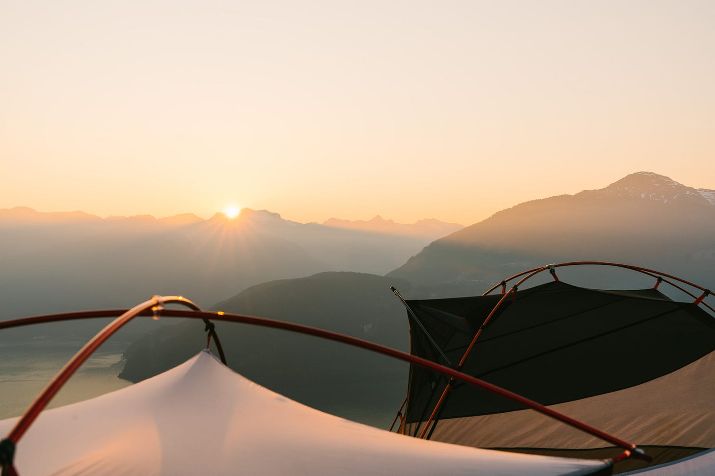 We started the trip with an overnight on a helipad in Howe Sound. In typical coastal mountain style, the trail was basically straight up -- but the 360 views at the top were worth it. You wind upwards through dense forest before topping out at the helipad -- there's just enough room for a few tents. We enjoyed our dinner and few beers with the wild views. There was a bit of haze, a result of wildfires in Northern Alberta blowing over to BC. It made for a pretty surreal sunset.