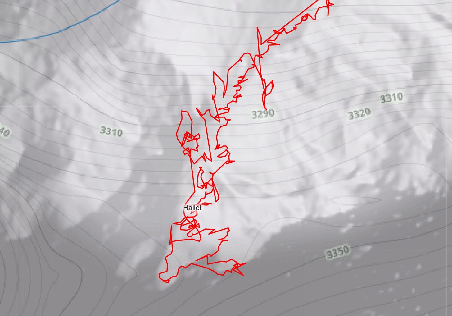 GPS can do elevation calculations, although most applications use a Digital Elevation Model (DEM) because it is often more accurate than using elevations derived from GPS. In locations where the topography changes rapidly, like canyons and steep, mountainous terrain, there can be huge jumps in elevation change over minor horizontal distances. So, if your GPS point is off even a little bit, that could compound into a huge elevation discrepancy. Naturally, this also increases in places where there are less established or no trails, because apps have nothing to try and “guess” your exact route. Some watches also have barometers, which can either automatically or manually overwrite elevation calculations based on GPS in tracking apps. Using that same track as before, we can see how the GPS went absolutely wild as soon as I started climbing and later skiing this steep and narrow couloir.