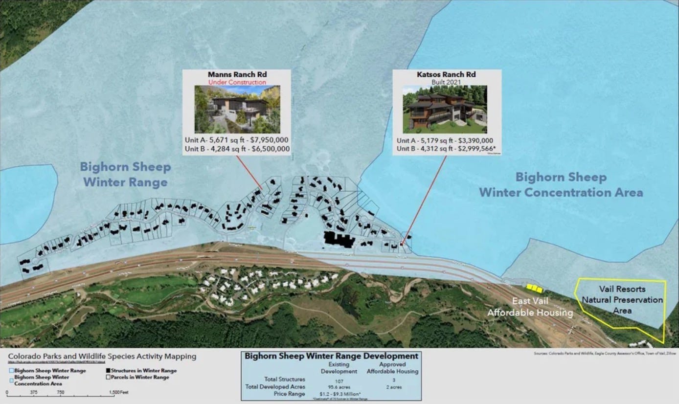 First, there’s the question of whether the town was truly being “fair” about this development. Multi-million dollar single-family homes have no issue getting approved without controversy in the adjacent East Vail neighborhood, despite also intersecting with sheep habitat. Notably, although the review and recommendations were made in 2019, the town of Vail has not implemented said guidelines and regulations for the tract of luxury housing.