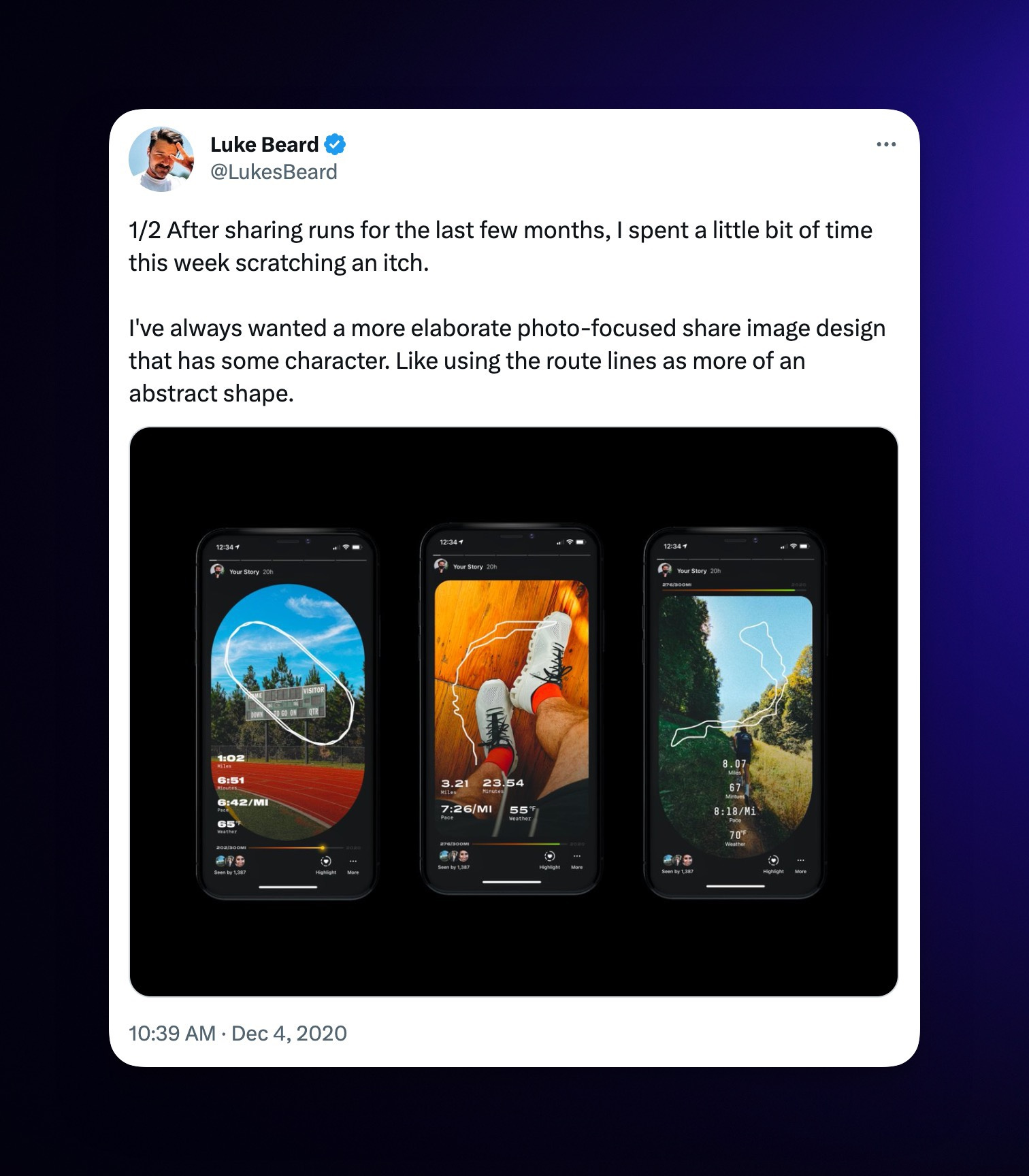 Luke was (at the time) the CEO of Exposure, a visual-storytelling platform that I’ve used on and off for nearly a decade. Luke connected with Dan Kuntz and just a short time later, the first iteration of Any Distance was born. Think of this early version as an “Unfold” for runners – you could connect it to the activity tracker of your choice and get beautifully designed, shareable images of your workouts. Although I’m a less frequent Instagram user than I used to be, I still post frequently on my stories, and the designer in me loves the way that these look.