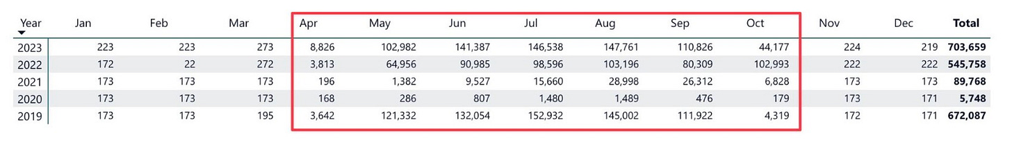 It seems that this is a trend likely to continue. Princess Cruise lines recently announced that January 2024 set a new record, “with an over 20% surge in Alaska bookings, the highest in the cruise line’s history for this period”. Particularly illustrative is the change in the beginning/end of season visits over the last few years (not that both 2020 and 2021 were affected by Covid restrictions)