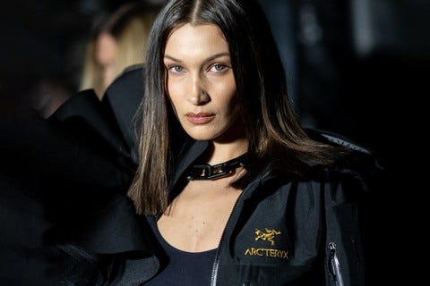You may not expect it, but the outdoor industry occasionally gets used in “fashion”. Salomon’s blacked-out S/Lab shoes were quite popular for a while, the North Face had a big foothold in streetwear (and they just released a new urban/city line called their Black Series). And this week. Virgil Abloh had the Hadid sisters wearing Arcteryx as part of the Off-White Fall/Winter 2020 collection.