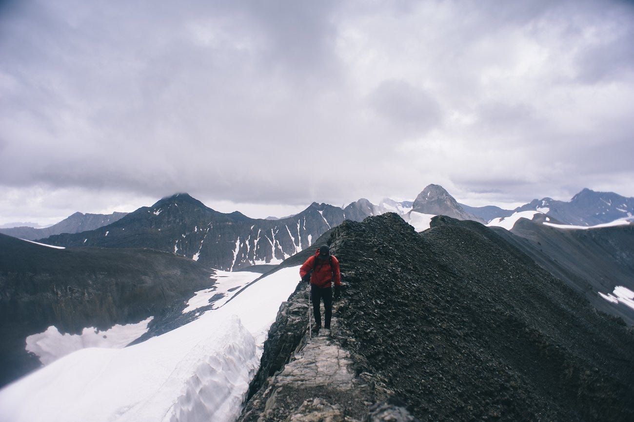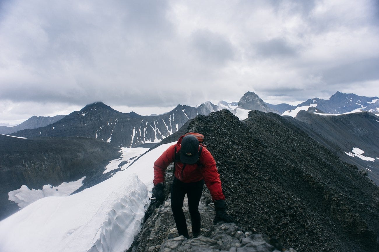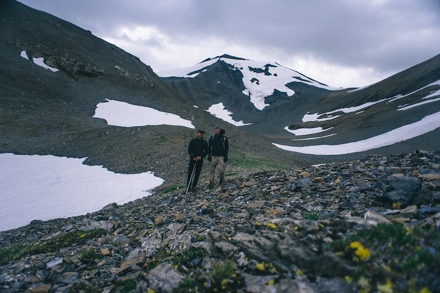 After climbing for 10 miles, 5,000 ft and 2 “detours”, we finally reached the top of Northover Ridge, a several kilometer stretch of ridge line that straddles British Columbia and Alberta. The trail stays right on the ridge, and while the drop on either side might not kill you, it's still a good idea not to slip.