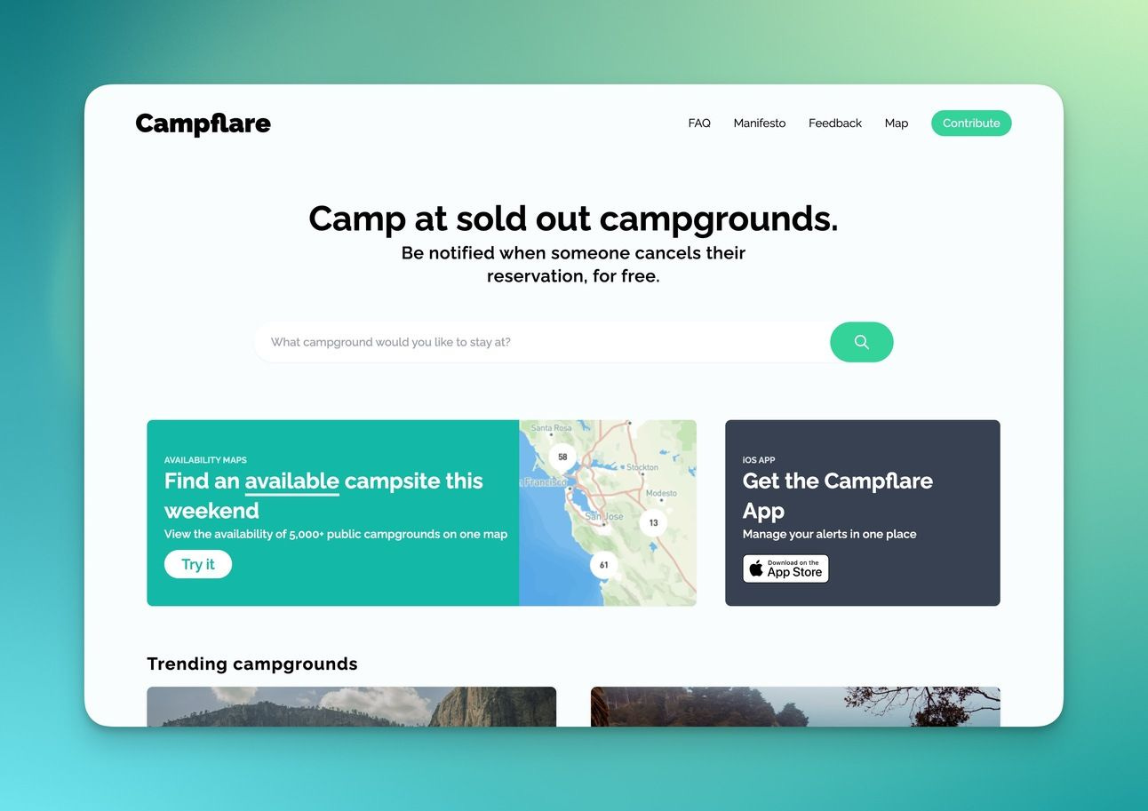 Campflare was approached by a major website in the camping space (not Hipcamp) with an acquisition offer. However, they were concerned by the terms of the deal, which involved integrating the tech into a single platform and charging users for access. Instead, Campflare chose to double down on their approach to accessibility and the Campflare API, which anyone can use to integrate Campflare notifications into their own applications. They hope to continue developing the API and become a robust hub for outdoor data — including integrating additional sources of camping availability data from private campgrounds and other reservation providers.