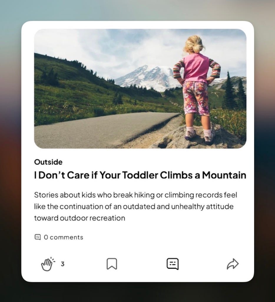 Notably, the new social features don’t offer any kind of way to quickly populate your feed, leading to a “cold start” problem. There are no connections to other social networks to help you build your graph and it’s somewhat unclear why a GaiaGPS user would want to see random Outside Magazine articles or Trailforks content in their mapping app. I opened my “home” feed to an article titled “I Don’t Care if Your Toddler Climbs a Mountain” – a story published in 2021 that is indicative of Outside’s constant re-sharing of their most successful “engagement-bait” articles over and over again (I’ve seen this one a dozen times across several social platforms). The initial experience is not an inspiring one – I have no desire to follow Outside brands or authors inside a mapping app, I don’t know any friends who are active in the Outside network, and it’s unclear who I would expect to reach by sharing my other activity here that I wouldn't on Strava or other social platforms.