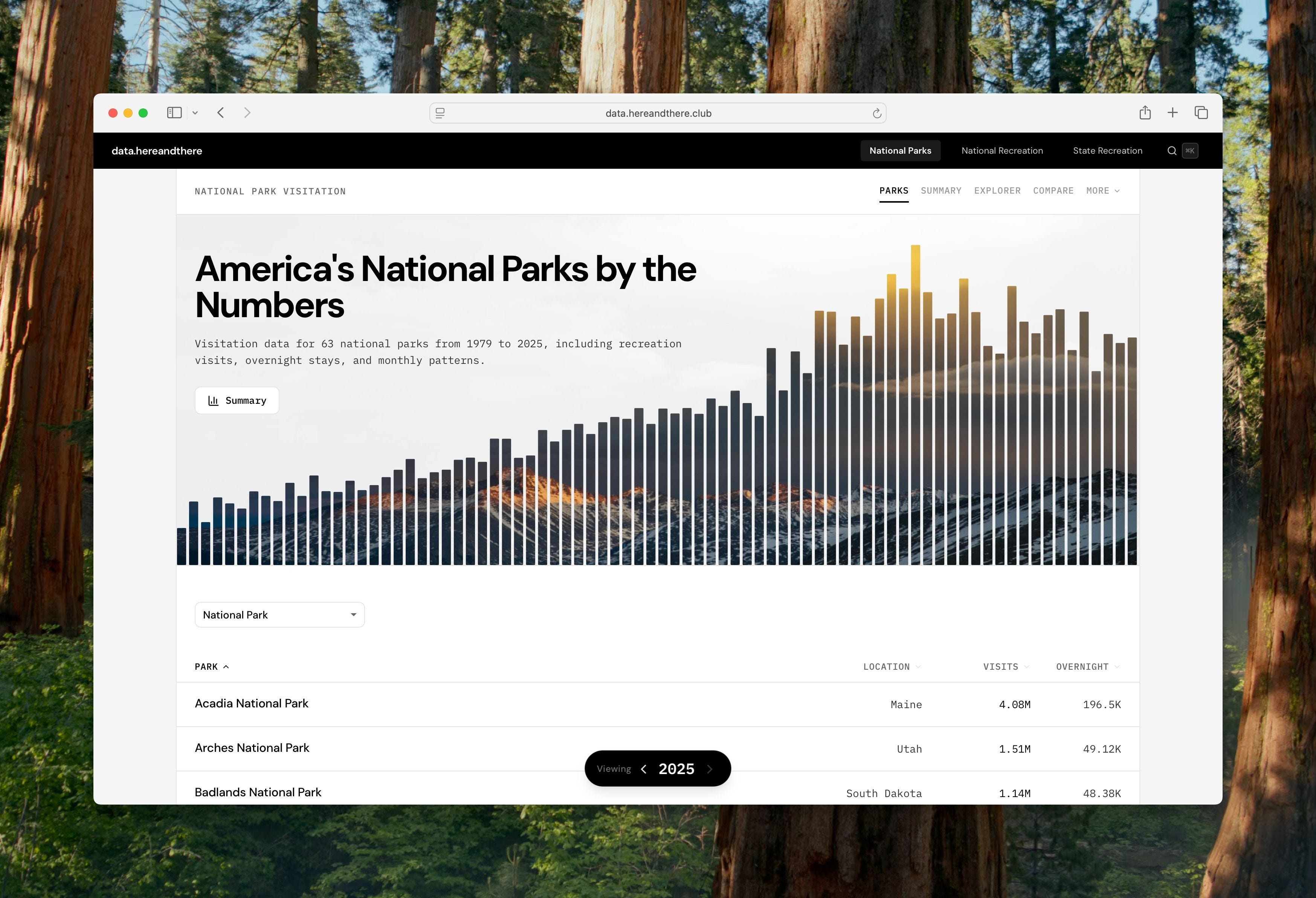 So I built something. data.hereandthere.club is a free, interactive tool that takes all of this data and puts it in a more accessible format, for everyone. You can explore NPS visitation data for all 400+ locations in the National Park System from 1979 to 2025, and see the full BEA outdoor recreation economy data at both the national and state level from 2012–2024.
