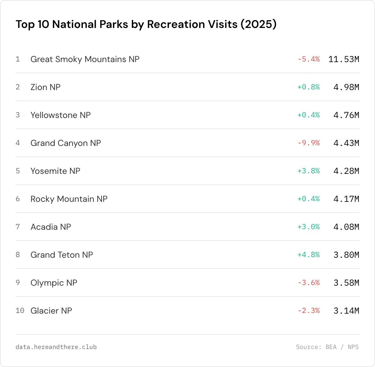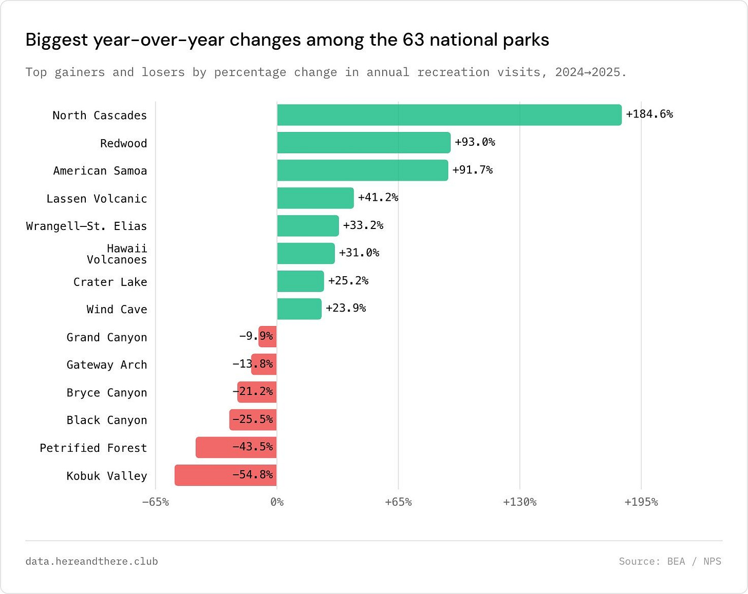 323 million people showed up to national park sites in 2025. A lot. But that number is more about the inertia of domestic travel demand than the true health of the parks, or visitation patterns. I don’t think the question for 2026 will be the headline count. There’s a decent chance it’ll be another banner year, there are a lot of people. But I think there’s open questions about whether the data will even be reliable, whether the smaller sites will keep bleeding out, and whether the parts of the industry that depend on international visitors are about to have a very bad year.