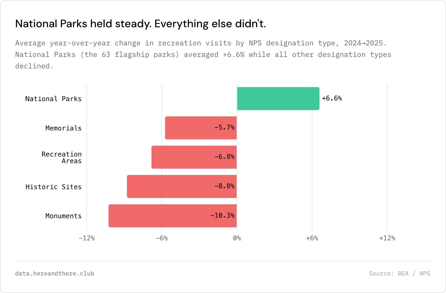 Visitation to the 63 national parks was nearly flat. The system-wide decline is being driven almost entirely by everything else. The NPS manages 433 units in total: 63 national parks, plus 85 national monuments, 31 national memorials, 25 battlefields, 58 national historic sites, and a bunch of recreation areas, seashores, parkways, and other designations. These sites sometimes get overlooked when we think about the “National Park Service.” But they drive a ton of overall visitation, and they’re where the steepest declines were last year. 84% of monuments saw visitation declines. 79% of historic sites. 74% of memorials. The national parks themselves were mostly fine (the avg % change across parks was +6.6).