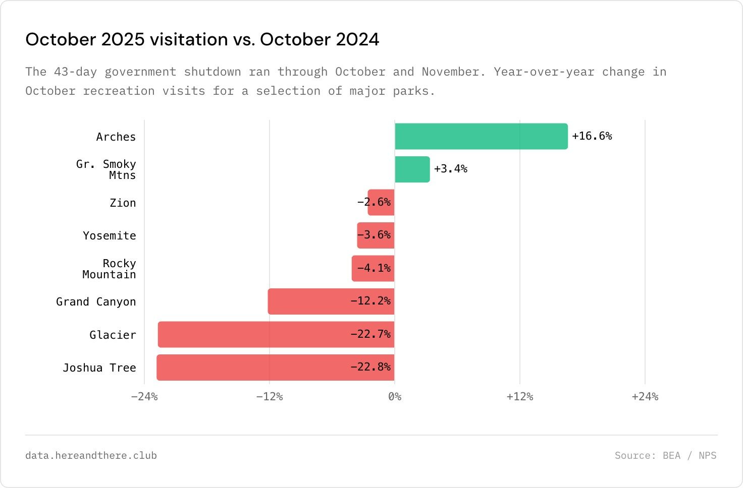 Some of the parks that stayed open captured displaced demand. Arches, which ended its daily permitting system early when the shutdown hit, ended up with a 16% gain in October year-over-year. Though, it’s worth noting that correlation isn’t necessarily causation here; nearby Dead Horse Point State Park also saw an October increase without any permitting system, and Goblin Valley was up 40%.