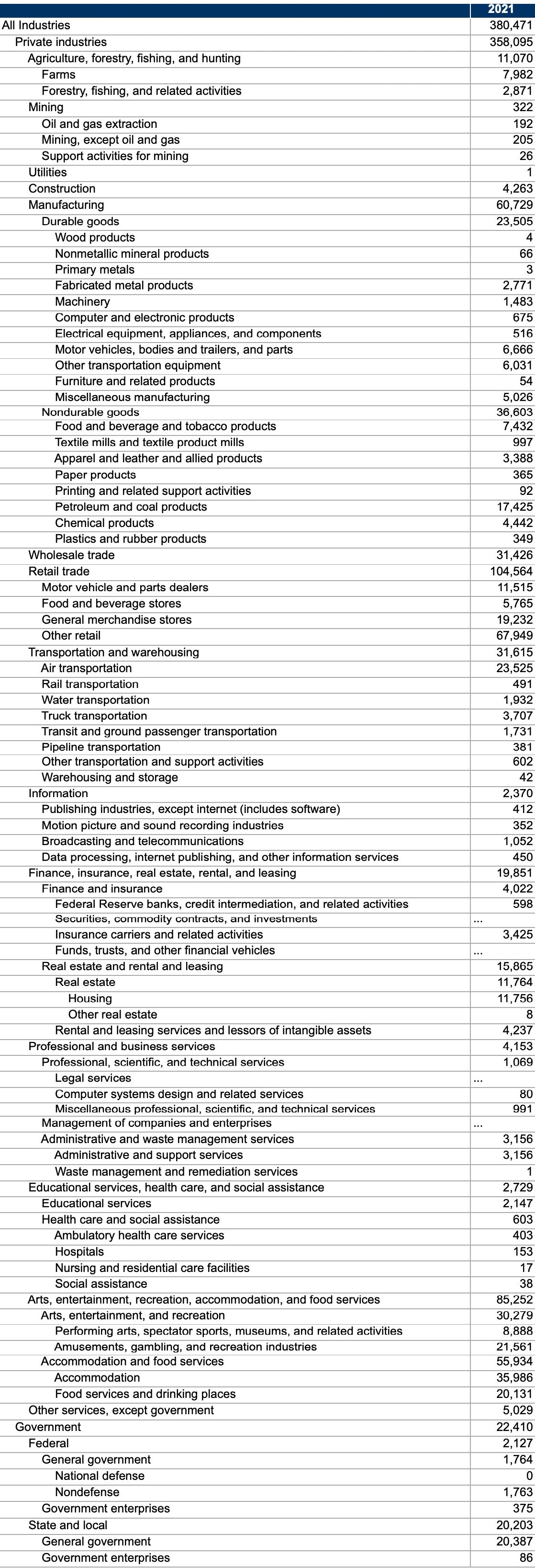 As I mentioned above, the Outdoor Recreation Economy is made up of economic output from a ton of different places. I highlighted a few interesting ones above. It’s an interesting experience to look at the full list and think about how spread out this impact is. Some things seem obvious, like Retail Trade making up 26% of the overall dollar value added, or Accommodation counting for $35B (as expected, big increase from 2020). But It also includes things like $31B of impact from Transportation and warehousing — which I believe is focused on transporting Outdoor Recreation-related goods around the country. Petroleum and Coal products is likely so high because petroleum-based synthetic materials are in nearly *everything.