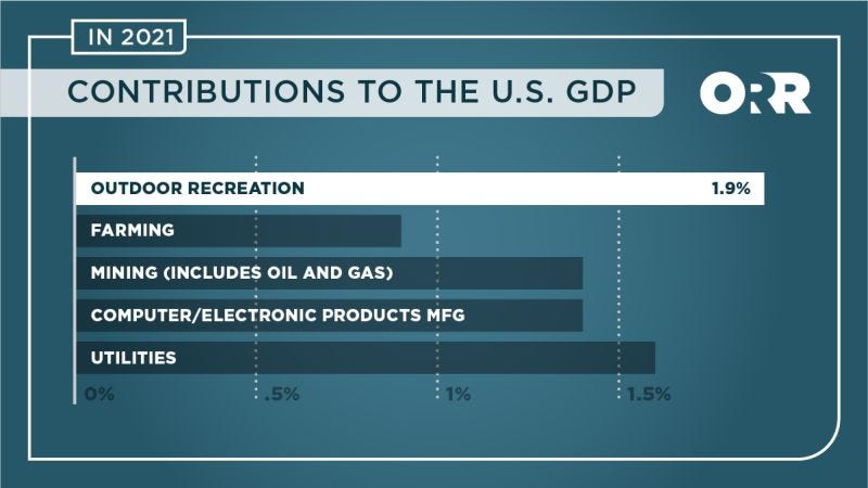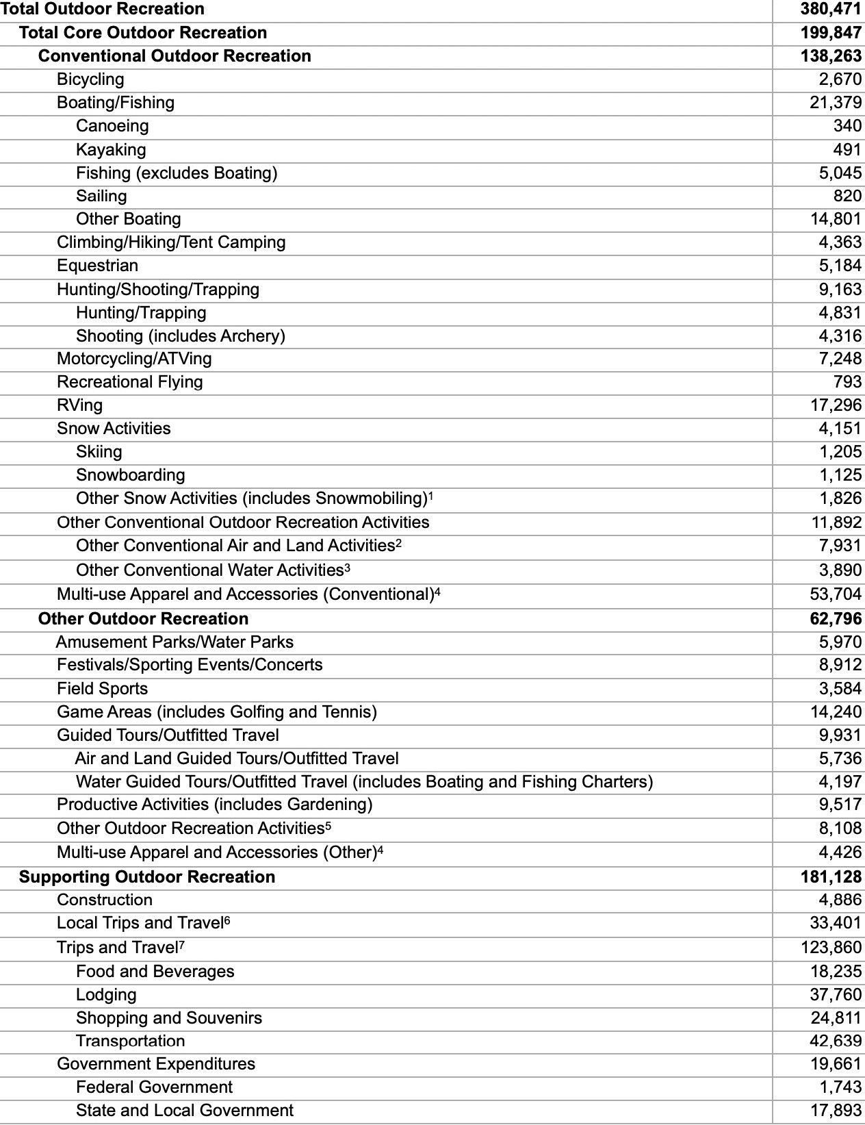 I don’t have a sprawling thesis here, but it’s always good to take a moment to *really* think about something like this. The long-tail of the recreation economy is massive, and includes both obvious and surprising things. It’s spread across a myriad of industries and activities. It’s not just you and I buying outdoor gear and camping on the weekend. It’s the truck that got that gear to REI (or your front door), the companies that manufactured that gear, the companies who sold that manufacturing equipment, and the suppliers that provided the raw materials. It’s the ski shop, the skis, the EPIC/IKON pass, the flight, the Airbnb, the lessons, the expensive on-resort food, the ambulance bill, and the sports rehab. It’s more than hiking trails — it’s people “recreating” outside, for any reason from gardening to kite flying or birdwatching.