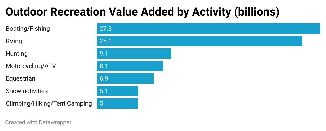 I think this might highlight a disconnect in how most people think about the “outdoors” and what the breadth of the “Outdoor Recreation Economy” actually is. Those powerboats on Lake Powell that “everyone” hates? Recreation economy. Those loud and annoying motorcycles and ATVs in Moab? Recreation economy. Boomers in RVs crowding your national parks? Recreation economy. Horses? Recreation economy. Waterparks, golf, paintball, gardening, skateboarding? All recreation economy.