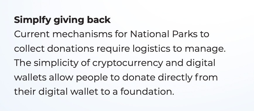 I’m all for finding unique ways to drive $$ to parks. That’s potentially a big chunk of money. Web3/blockchain has drawbacks/trade-offs but I’m not completely against interesting uses of blockchain technology. Money towards parks = usually a good idea.