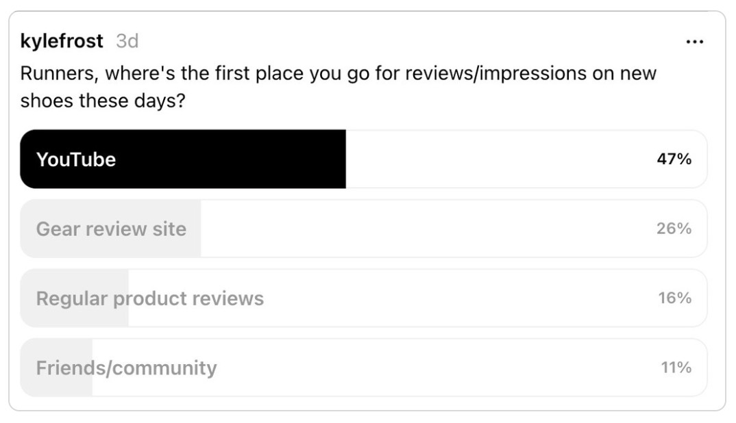 Gordon Wright, founder of Outside PR, the agency for Hoka, says that YouTube has become a valuable channel for the brands they work with. “Runtubers are critically important in the purchasing decisions of many runners. Increasingly, we're seeing the power of multi-media creators like Believe in the Run, Road Trail Run and Doctors of Running – they combine web reviews with online, social and video content that maximizes their reach.” My own experience and (very) anecdotal research confirms this; in a quick poll to my audience on Threads, 47% of people said they go to YouTube first.