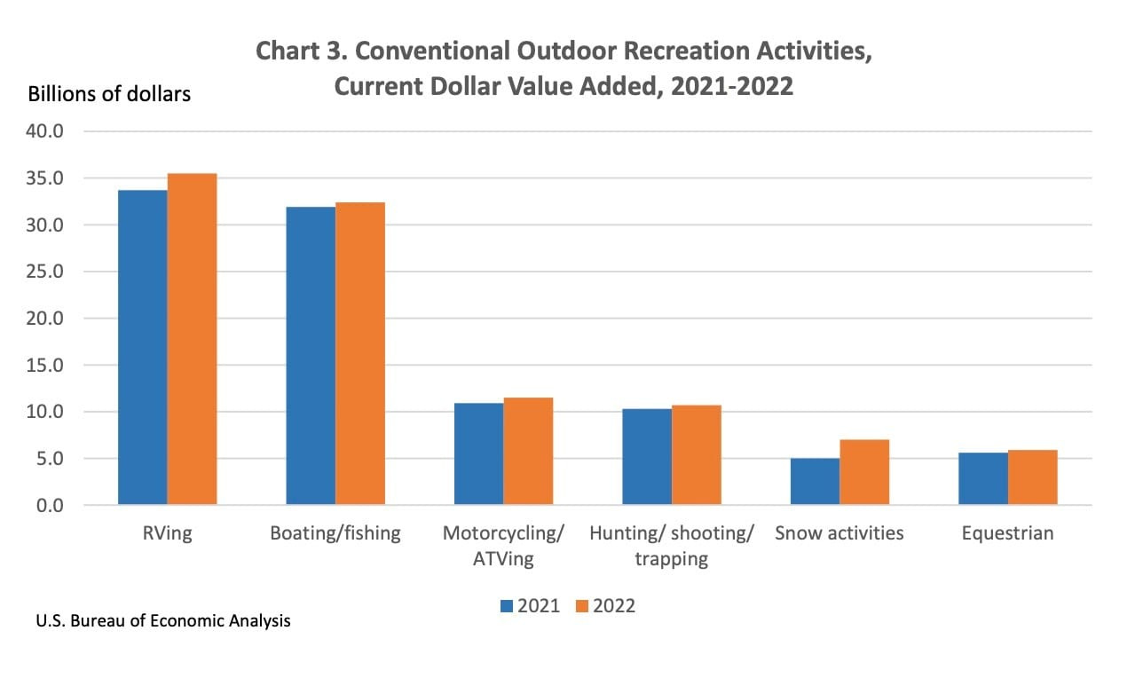 The top conventional outdoor recreation contributors for 2022 were RVing, Boating/Fishing, Motorcycling/ATV, Hunting/Shooting, Snow activities, and Equestrian. You’ll have to drop down to #7 to find Camping/Hiking/Climbing, which contributed just 1% of the total value added.