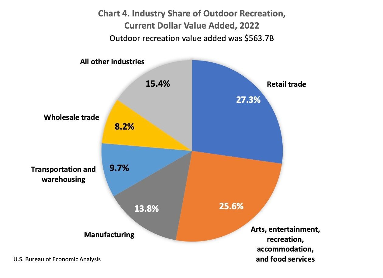 “Inflation-adjusted (“real”) GDP for the outdoor recreation economy increased 4.8 percent in 2022, compared with a 1.9 percent increase for the overall U.S. economy, reflecting a deceleration from the increase in outdoor recreation of 22.7 percent in 2021. Real gross output for the outdoor recreation economy increased 7.5 percent, while outdoor recreation compensation increased 9.1 percent, and employment increased 7.4 percent.” - BEA.