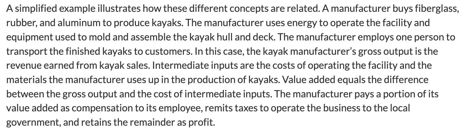 For example, the “Retail” category might include everything bought at REI, but only the sporting goods bought at Walmart. It also includes things you might not immediately expect, like the gross output from oil and gas extraction on public lands, a range of categories related to manufacturing outdoor goods, the transportation of those goods by air, water, and land, as well as finance, real estate, agriculture, construction, and more. In all, there are 95 different industry categories that make up the “outdoor recreation economy”. Here's one example from the BEA.