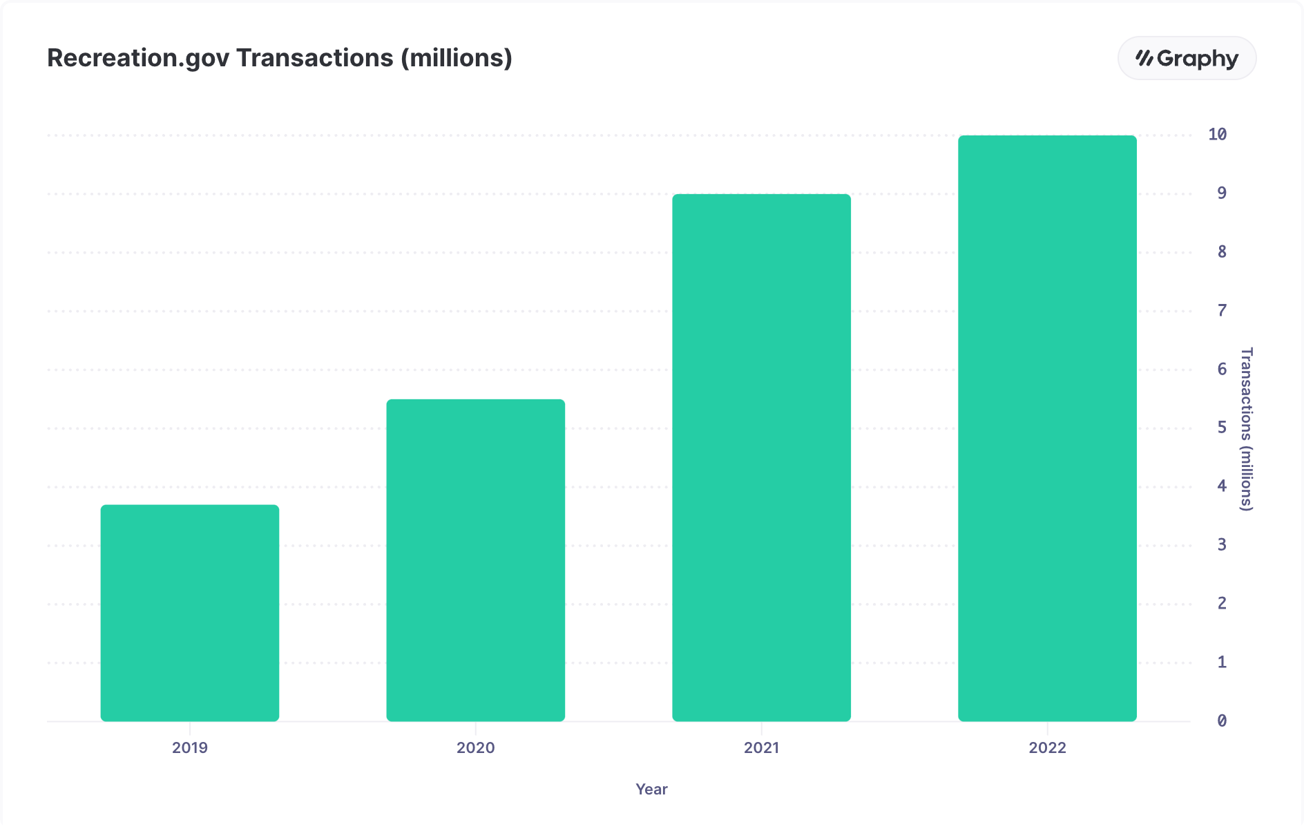 In Olympic National Park, officials estimated that the previous permit system took park staff approximately 15 minutes per permit to process—for 20,000+ permit applications a year. That’s 5,000 staff hours that are saved every year by moving the process to Rec.gov, and 5,000 hours that staff can focus on the things they’re good at, rather than doing manual data entry in an antiquated system. That’s just one national park, and only the 14th most-visited in 2022.